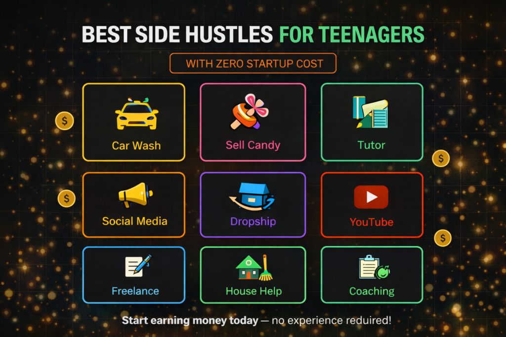 The best side hustles for teenagers with no money are service businesses (such as car washing and lawn care), tutoring, freelancing, and YouTube — because all of these require zero or near-zero startup costs and can start earning within days or weeks.